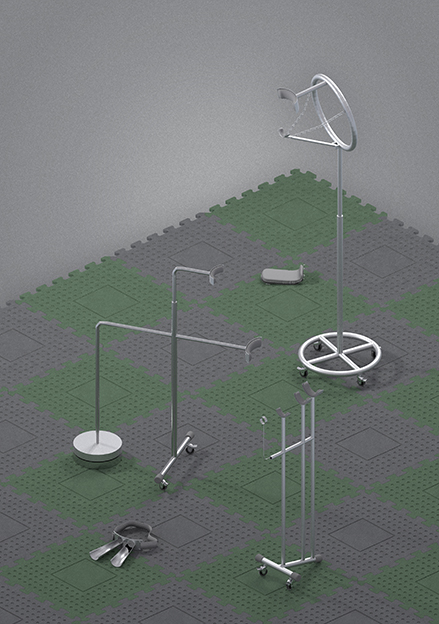 The Idle Institute presents The Itches: A Gym for Public Embarrassments [2018]. The work manoeuvres around five bespoke exercise machines, designed to perfect instances of minor public humiliation. The apparatus sits inside a grey institutional display, layering atmospheres of contemporary bureaus, design fairs, medical waiting rooms and gym spaces. Each has a set of instructions in the form of narrative manual—embedded in an online interface (http://show.idle.institute). Through analysing the language and voices of customer service labyrinths, motivational talks, helplines and public transport alerts, the Idle Institute attempt to engage the seductive and dystopian narratives of self-optimisation and self-protection. Prior to the show, the machines were photographed in a manner mimicking hypersexualised gym advertisements. They were uploaded with hashtags such as #sisyphuswasjustworkingout and #adamconnect alongside standard fitness tags #gym #workout #push, attracting a following of gym goers and gurus worldwide.