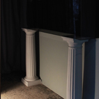 The doric columns are built hollow and each one held by a giant hand, the hand of a god-like creature placing it down firmly and fatefully. If an incision were made into the trembling torso of the colossal column it would be like a window into the soul of the columns’ Doricness, the soul of the object. Inside the columns are lined with baroque, heavy velvet and bathed in light. Inside the hollow of the exquisitely proportioned column lies the soul of the object for the audience to see: her once beautiful now decomposing face.
